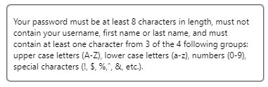 Once the temporary password has been entered, the system will prompt you to create a new password. This password will need to adhere to the following criteria: