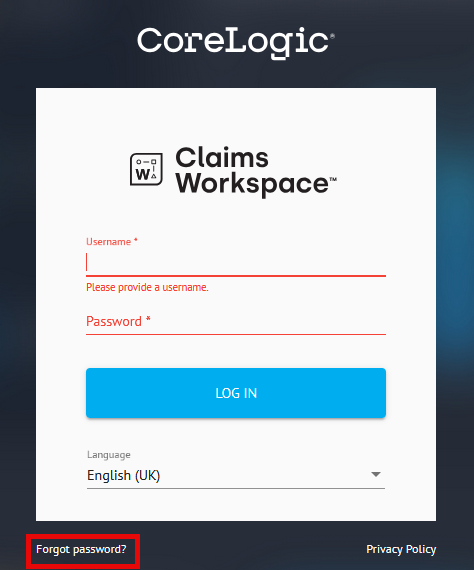 On the Claims Workspace login page, click on Forgot Password.