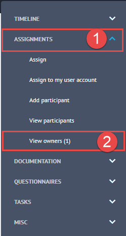 To revoke your own ownership, login to Claims Workspace and search for the required claim. Within the grey options menu, select Assignments (1) and click on View Owners (2).