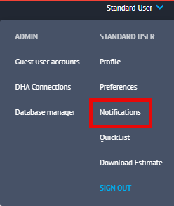 Notifications can be set up for each individual user on their account. To do this, you will need to select the drop-down next to your name followed by Notifications.