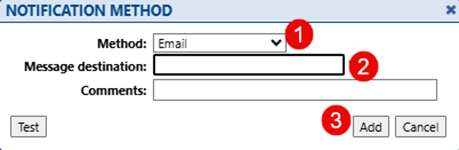 A pop-up box will then appear. Here you can choose the method type you require (1) and a message destination i.e.; email address or mobile phone number (2). Once you have outlined these, click Add to create the method (3).